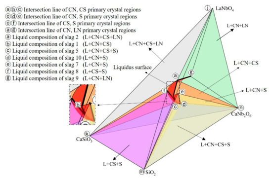 Bases on the above research results, the 1200 °C isothermal phase diagram of CaO-SiO2-La2O3-Nb2O5 system in reducing atmosphere was constructed, as shown in Figure 8. The ⓐ–ⓒ, ⓒ–ⓔ, ⓒⓕ, ⓐⓖ curves are not only the intersection lines of primary crystal regions mentioned above, but also the liquidus lines at 1200 °C, which divide the phase diagram into L+CN+CS+LN (ⓐⓚⓝⓙ tetrahedron region), L+CN+CS+S (ⓒⓚⓜⓝ tetrahedron region), L+CN+CS (ⓐⓑⓒⓚⓝ region), L+CN+S (ⓒⓓⓔⓜⓝ region), L+CS+S (ⓕⓚⓜⓒ tetrahedron region) and L+CN+LN (ⓐⓖⓝⓙ tetrahedron region) equilibrium phase regions. Meanwhile, based on these liquidus lines, the liquidus surface could be plotted in the phase diagram, and the area enclosed by the liquidus surface was the low melting point region of the CaO-SiO2-La2O3-Nb2O5 system.