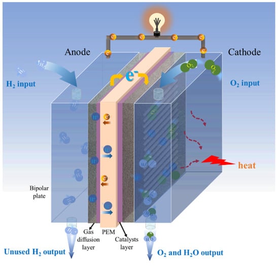 In recent years, the fuel cell has experienced rapid development in various fields, because of its advantages of being pollution-free and highly energy efficient [1,2,3]. Among them, proton exchange membrane fuel cells (PEMFCs) are considered to be the next generation of energy equipment, due to their advantages of high energy conversion efficiency, zero-emissions, fast start-up, as well as low operating noise [2,4,5]. PEMFCs have a sandwich-like structure, which consists of shells, bipolar plates, and membrane electrode components (gas diffusion layer-GDL, proton exchange membrane-PEM and catalyst layer-CL) [6,7], as shown in Figure 1. When PEMFCs are working, hydrogen and oxygen gases are used as fuels, which go into the anode and cathode of the cell, respectively [1,7,8]. Under the action of the catalyst, the H2 change to H+ ions at the anode and then pass through the PEM to react with O2 at the cathode. The water (H2O) and energy (electricity and heat) are released after that [2]. In accordance with to several descriptions in the literature [1,2,7,8], the schematic diagram of the working principle is shown in Figure 1.