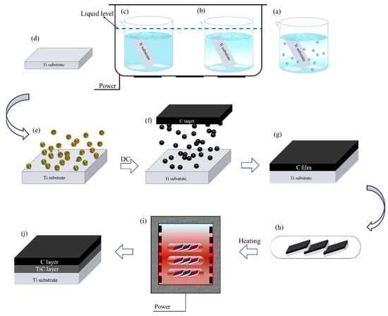 Schematic illustrations of preparation process of the nanocomposite coating: (a–b) preprocessing Ti substrate (including (a) Ti plate was immersed in 5 vol% HF solution; (b) and (c) Ti plate was cleaned ultrasonically with deionized water and alcohol, respectively; (d) dry Ti plate), (e–g) preparation process of single C layer (including (e) plasma cleaning; (f) depositing single C layer; (g) single C coating plate), (h–j) vacuum heat-treatment process (including (h) C coating Ti plates were sealed in quartz tube without oxygen; (i) the quartz tubes with single C coating plate were heated in muffle furnace; (j) C/TiC nanocomposite coating plate).
