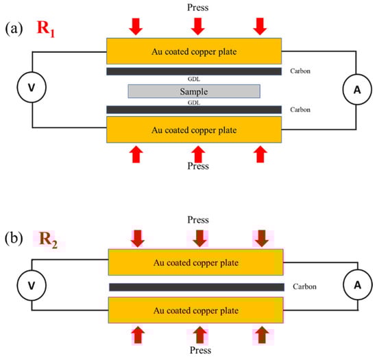 Schematic diagram of the ICR measurement. (a) the total resistance value of a bipolar plate; (b) the value of a carbon paper.