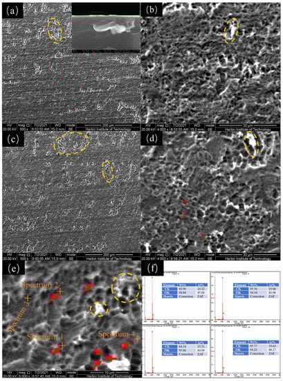 SEM images showing the surface morphology of (a,b) coating before vacuum heat treatment; (c,d) coating after vacuum heat treatment; (e) 8000× of coating after vacuum heat treatment; (f) EDX spectrum of coating after vacuum heat treatment.