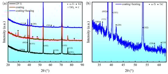 The crystal structure of the CP Ti and the as-prepared film’s titanium bipolar plates were analyzed by X-ray diffraction pattern (XRD). The XRD spectra of CP titanium substrates, deposition single C coating and C/TiC nanocomposite coating titanium substrates are shown in Figure 5. The titanium substrate (CP Ti) has only peaks corresponding to hexagonal α-Ti. The peaks representing Ti, TiO2 and C can be observed in the spectra of the single C coating. The TiC phase can be detected in the coating after heat treatment, which means the TiC was formed during heat treatment. However, the peak of TiO2 was not detected after heat treatment in Figure 5, because a carbothermal reduction of TiO2 happened and titanium carbide was prepared according to the general equation [43,44]:
