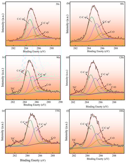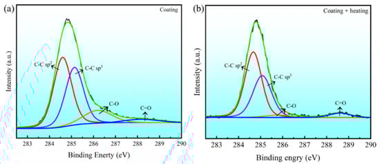 In order to further analyze the film’s composition and the carbon bonding states, the surface coatings before and after heat treatment were characterized by XPS. The XPS results were obtained by fixed 20% Lorentzian and 80% Gaussian [45] using XPS peak 4.1 software, as presented in Figure 6. It can be seen that the spectra were divided into four peaks, i.e., C-C (sp2), C-C (sp3), C-O and C=O [42,45,46]. The sp2 bond fraction of the C/TiC nanocomposite coating was higher than sp3; the area ratio of sp2 to sp3 in the C coating and C/TiC nanocomposite coating are 1.20 and 1.40, respectively. It can be explained that the sp2 content increased due to the graphitization of sp3 in carbon films with an increase in the temperature [47], the metastable carbon atom hybrid transitioned from sp3 to sp2, which means that the C/TiC nanocomposite Ti bipolar plate has better conductivity.