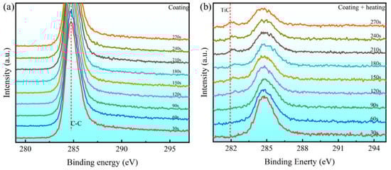 XPS spectra of C 1 s the depth profile (a) C coating; (b) C/TiC nanocomposite coating.