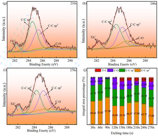 XPS spectra of C 1 s depth profile of C/TiC nanocomposite coating; (a–i) the depth profile of C/TiC nanocomposite coating at 30 s, 60 s, 90 s,120 s,150 s,180 s, 210 s, 240 s, 270 s, respectively; (j) the results of bond fractions measured.