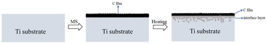 Commercial pure titanium TA1 (CP Ti) was used as the bipolar plate substrate. The CP Ti substrate was cut into pieces with size of 30 mm × 30 mm × 0.1 mm, and was immersed in a 5 vol% HF solution for 30 s in order to remove the oxidized layer. Then the CP Ti substrate was cleaned ultrasonically with deionized water and alcohol for 15 min to remove organic substances, and dried at room temperature. Next, the Ti substrate was put into the vacuum chamber of the deposition system. A DC power source was applied to a graphite target (purity 99.99%) to deposit a single C layer on the CP Ti substrate by magnetron sputtering technology. Prior to the deposition, the vacuum chamber of the deposition system was vacuumized until the pressure was lower than 1 × 10−3 Pa, then the pressure was maintained at approximately 0.5 Pa by introducing pure Ar gas. The CP Ti substrate was etched by ion spurring with 300 V negative bias voltage and 2 A current for 15 min to remove the oxide layer of the substrate surface. Finally, A 400 V negative bias voltage and 3 A current was applied to the graphite target to prepare a single C layer, which was maintained for 2000 s. During the C film deposition process, the flow of Ar and duty cycle were maintained at 40 sccm and 20%, respectively. Then, the single C coating specimens were sealed in a quartz tube without oxygen, and were heated in a muffle furnace at 700 °C for 210 s. The schematic illustrations of the preparation process of the nanocomposite coating is shown in Figure 2. In this work, the coating is recorded as a single C coating, and coating + heating is recorded as C/TiC nanocomposite coating.