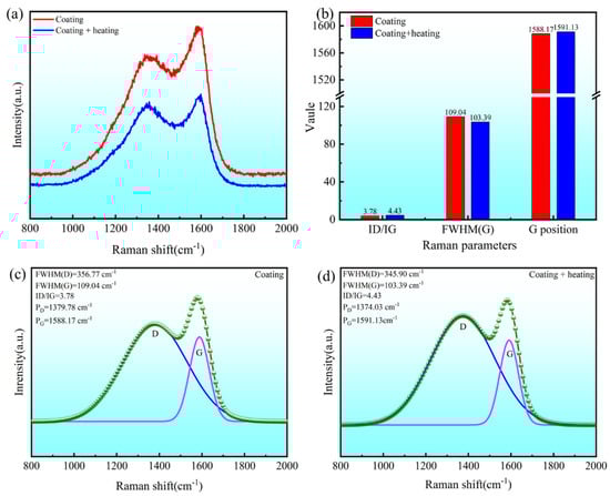 Raman of the C coating and C/TiC nanocomposite coating. (a) the Raman spectroscopy of C coating and C/TiC nanocomposite coating; (b) the results of ID/IG, FWHM(G) and G position; (c,d) the curve fitting of C coating and C/TiC nanocomposite coating.