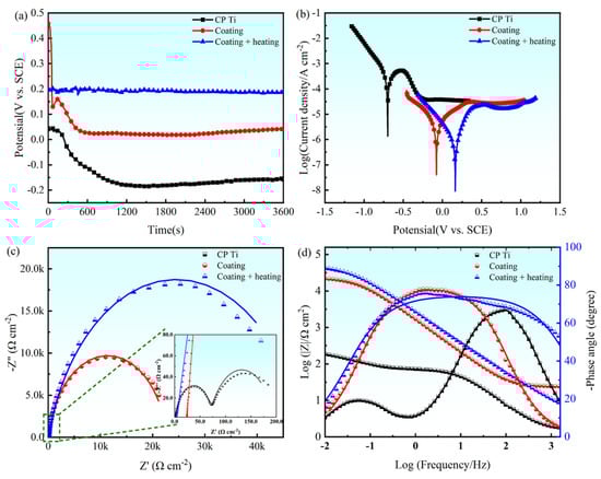 The electrochemical test curves of CP Ti, C coating and C/TiC nanocomposite coating: (a) OCP; (b) potentiodynamic polarization curve; (c) Nyquist plot of EIS; (d) bode plot of EIS.