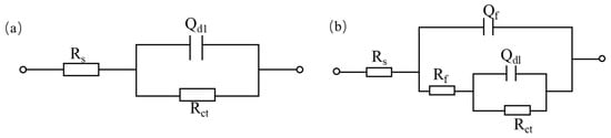 The Electrochemical Impedance Spectroscopy was analyzed by equivalent circuits using the ZView software, as shown in Figure 12. According to the characteristics of the three specimens in this work, the equivalent circuit with one time constant (Figure 12a) was applied to the coating and the C/TiC nanocomposite coating Ti plate, and two time constant (Figure 12b) was applied to CP Ti to analyze their corrosive behavior. Among the equivalent circuits, Rs, Rf and Rct corresponded to the resistance of the solution, the pore resistance in the film and the charge transfer resistance, respectively [20]. In addition, a constant phase element (CPE) was introduced to describe non-ideal capacitance of passivation film or C film. The Qdl and Qf represent electric double layer capacitance and the capacitance of passivation film or C film [59]. The constant phase angle element impedance can be calculated by Equation (8):