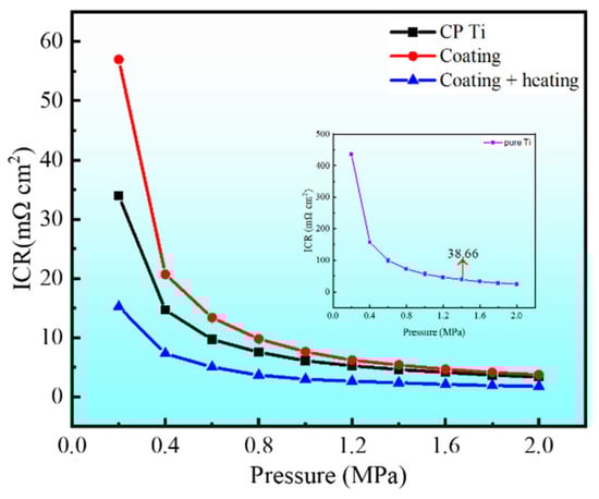 Interfacial contact resistance (ICR) is a key parameter to measure the conductivity of a material that directly affects the output power of the bipolar plate. In general, the ICR between GDL and bipolar plates is inversely proportional to the power density and performance of PEMFC. The ICR, CP Ti, C coating and C/TiC nanocomposite coating specimens were investigated using the method reported by Wang et al. [39] (Figure 3), and it was calculated by Equations (4)–(6); the results of ICR was shown in Figure 13. By increasing the pressure, the ICR value of all tested specimens decreased. The ICR dropped significantly in the low pressure area because the effective contact area between GDL and BPs increased with the compaction force. However, ICR keeps relatively steady at high pressure range; this relates to roughness and chemical components of bipolar plates. It can be observed that the C/TiC nanocomposite coating bipolar plate exhibits lower ICR than a single C coating and CP Ti bipolar plate. Under pressure of 1.4 MPa, the ICR of C/TiC nanocomposite coating and C coating is 2.34 mΩ cm2 and 5.34 mΩ cm2, respectively. Compared to the single C coating Ti, ICR of C/TiC nanocomposite coating Ti decreased 2 times, which meets 2020 DOE target level (10 mΩ cm2). The result was consistent with Raman and XPS. However, a single C coating had a highest ICR value among the three specimens, and it may have the roughest surface [25,62] and the lowest ID/IG, which could be seen from SEM, Raman and XPS. It must be pointed out that the ICR of the CP Ti (black solid line) is lower, which was pre-treated to remove the surface oxide film (TiO2). The ICR of raw pure Ti (purple solid line in illustration) is 38.66 mΩ cm2, as shown in the inset of Figure 13. It well known that TiO2 possesses semiconductor properties to increase the ICR of the bipolar plate, and directly affects the conductivity of the battery. Moreover, compared to the ICR values in Table 4, it shows that the ICR value of the as-obtained C/TiC nanocomposite coating is much lower than that for noble-doped metal coating [29], a-C coating [13,20,21,37,40,41,42,52], metal carbide and nitride coating [8,19,23,34,35,38,53,59,60,63], but is less than Ag-doped coating [30], a-C coating [52,54], metal carbide and nitride coating [36]. So, this work is significant to improve the conductivity of bipolar plates in PEMFCs.