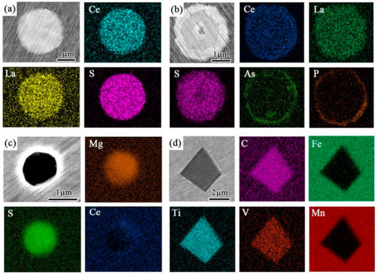 SEM images and EDS maps of the element distribution in the inclusions: (a) RE sulfide, (b) RE sulfide absorbing As and P, (c) MgS, and (d) carbide.