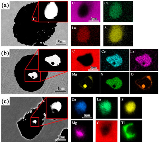 Inclusions with a large contact angle and large size tend to aggregate. Inclusions are prone to grow upwards as a result of element diffusion with an increase in melting time. Similar inclusions form large spherical inclusions, while different inclusions aggregate to form complex compounds with lower energy. In our study, several kinds of composite inclusions were carried out, as shown in Figure 4. The images of MgO surrounded by RE2S3 and of RE2S3 surrounded by MgO are shown in Figure 4a,b, respectively. MgO and RE2S3 grew next to each other in the spherical state and had little difference in shape and size from a single inclusion, such as MgO, MgS, or RE2S3. Carbide, accompanied by RE2S3, grew upwards into a blocky inclusion (Figure 4c). The size of carbide, with the core of an Al-Mg-Si inclusion, was more than 10 μm and had the shape of an irregular, long strip (Figure 4d). More complicated multiple inclusions, including RE2S3, MgO, and carbide, are shown in Figure 4e. The results above fully prove that the originating nuclei are oxides, mainly MgO, on which RE sulfides nucleate and on which Ti carbides nucleate. Although some large-size composite inclusions were retained in the investigated CGI, the formation of composite inclusions with a large size was beneficial to the reduction of energy and the removal of large inclusions through floatation.