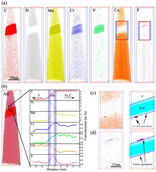 P is a kind of element which is easily concentrated. In our study, the concentration of the P atoms towards the phase boundary was 0.8 at.% with a width of segregation region of about 5 nm, as shown in Figure 6b. The accumulation of the P atoms was found to be continuously distributed at the interface, which is different from the distribution of Cu (Figure 6d). P has low chemical activity and rarely reacts with other elements chemically at the early stage of alloy solidification; thus, a large amount of P remained in the un-solidified liquid. Although the content of P segregation was not high enough to promote the precipitation of phosphorus eutectic, the segregation of the P atoms still reduced the interface binding force between the Fe atoms and increased the interface brittleness.
