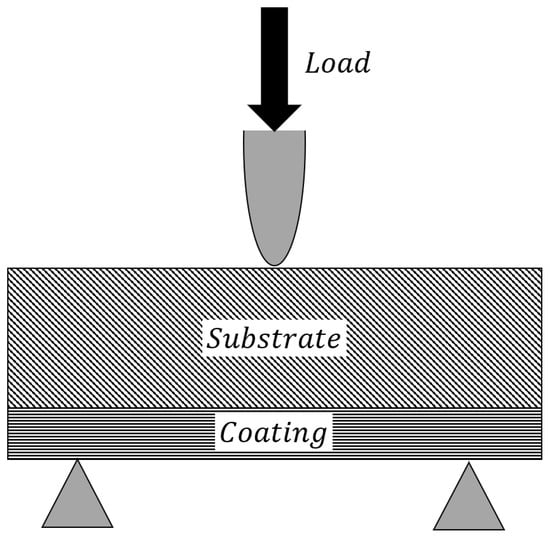 High-entropy alloy powders of FeCOCrNiMn (by Vilory Advanced Materials Technology Ltd., CN) were provided in equiatomic composition [9]. Particles were characterized before spraying through scanning electron microscopy with a ZEISS EVO40 microscope. Particles were cold-sprayed on V-notched carbon steel substrates (120 mm × 30 mm × 15 mm) with a PCS-100 high-pressure cold-spray machine (Plasma Giken Co., Ltd. Osato, Saitama, Japan). Prior to deposition, the surfaces of the carbon steel sheets were grit-blasted with alumina (F24) to roughness Ra ≈ 7 µm. The temperature and pressure employed during spraying were 1100 °C and 7 MPa, respectively. The stand-off distance was 15 mm, the power feed was 2 rpm, and the robot speed was 500 mm/s [9]. These processing parameters were employed because, in our previous work, they were identified as optimal for high-density and high-adhesion-strength coatings. Powders and coatings were characterized though X-ray diffraction (XRD) by employing a Malvern PANalytical X’Pert PRO MPD θ/θ Bragg–Brentano with X’Pert software (Malvern, UK) for phase analysis, with Cu Kα (λ = 1.5418 Å) radiation and a working power of 45 kV–40 mA. X-ray diffraction was also employed for the measurement of residual stresses in a direction parallel to the spray direction by removing thin layers through electropolishing before each measurement [44]. Metallographic preparation was carried out in accordance with the ASTM E1920-03 standard. The coating microstructure was observed by employing the Leica DMI 5000M optical microscope (OM). The Leica microscope image analyzer was used to calculate the coating thickness. The Shimadzu HMV (Tokyo, Japan) was used for 10 measures of microhardness on the Vickers scale for each coating, with a load of 0.1 kg of F (HV0.1). Cyclic three-point bending tests were performed on the cold-sprayed sheets by employing a Zwick/Roell standard testing machine. The test configuration is shown in Figure 1.