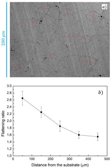 By revealing the aspect of the splatted particles, we measured the flattening ratio at different distances from the substrate as the width-to-height ratio for each single splat (Figure 4a). The variation of the flattening ratio as a function of the distance from the substrate is shown in Figure 4b.