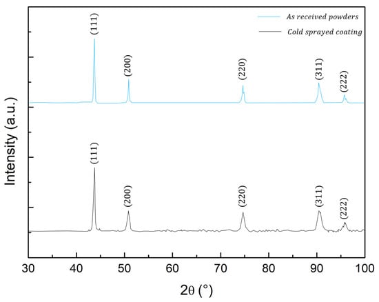 The XRD profiles of the as-received particles and of the coating are shown in Figure 5. The XRD peaks of both the as-received powders and the as-sprayed coatings revealed that the face-centered cubic structure was retained after severe plastic deformation of the material. In addition, peak broadening was observed for the as-sprayed coating; this can be attributed to the residual strain induced in the material upon impact. This aspect is more precisely described during the discussion about the residual stress measurements along the coating thickness.