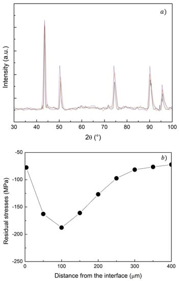 The broadening of the peaks revealed the induction of residual stresses in the coating as a consequence of the cold-spray processing. The XRD peaks at different levels from the coating top surface, revealed by removing very thin layers before each measurement, allowed for the definition of the residual stress profile as a function of the coating thickness (Figure 7). The residual stresses in the same direction of the spray are shown in Figure 7b.