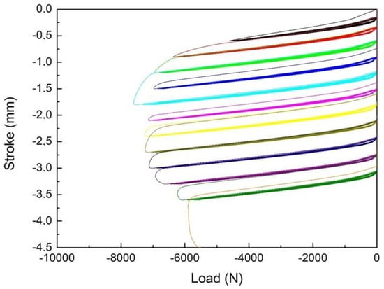 In the present study, the cyclic behavior of the coatings was evaluated through three-point bending tests conducted at various levels of the maximum stroke. The load versus stroke curves for different maximum deformation imposed on the samples during cyclic bending are shown in Figure 9.