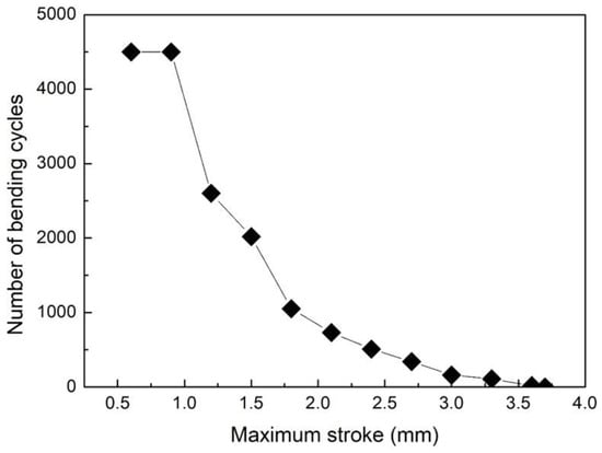 As expected, the first crack nucleated at a lower number of bending cycles as the maximum stroke increased.
