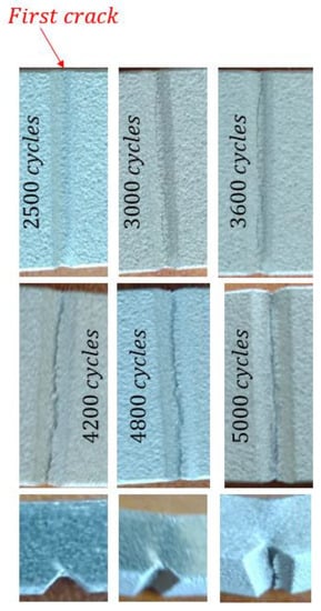 Damage evolution in the coating after different cycles of bending loading at 1.2 mm maximum stroke. As is clear from the pictures, the crack nucleated at the center of the notch without any additional crack at the notch periphery.