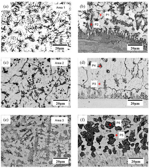 The composite structure consisted of a Ni-based intermediate layer and a NAB coating, with the thickness of 0.6–0.8 mm and 1.6–1.8 mm, respectively. The microstructures of the cross-section of the composite structures are shown in Figure 1. It can be observed that the microstructures of the composites are very different with and without an intermediate layer. The chemical compositions of the points are marked by the red cross and the upper zone of the NAB layer in Figure 1 is listed in Table 3. As seen in Figure 1a,b, the columnar and dendritic grains can be observed above the interface. The grains near the top surface are finer than that of near the interface. The grain type and size are determined by the ratio of solidification rate (R) and the temperature gradient (G). In the region near the fusion line, the temperature gradient G is largest here, and the solidification rate R is almost zero. Due to the constitutional supercooling condition, the solid–liquid interface grows in planar manner with slow speed from the interface towards the liquid phase. Any small bulges on the solid–liquid interface will be melted by the superheated area of the liquid; thus, solid liquid interface moved forward with a planar interface. As away from the fusion line, G decreases and so does the ratio of G/R, so that the planar interface becomes unstable and the grains grow in a cellular manner and eventually grow into cellular and columnar dendrites. The thermal process during the laser depositing enhanced the element dilution at the interface so that extra steel melt mixed into the molten pool by the Marangoni force and subsequently solidified in the NAB layer. According to the Cu-Fe phase diagram [13], Fe has limited solubility in Cu, so that Fe-rich dendrites were observed in the NAB layer. Different from N-1, coarser α-Cu and fewer κ phases formed in the NAB coatings of N-2, which grew on the NiAl alloy intermediate layer, as seen in Figure 1c,d. The dark lines at the grain boundaries could be NiAl precipitates [14]. No Cr content was detected in Area 2, which indicates that the NAB was isolated well from steel by the intermediate layer. Figure 1e,f shows the different features from N-2. Few dark lines along boundaries could be seen, and grey columnar and dark cellular dendrites formed among the α-Cu. The raw material KF-306 contains 20 wt.% Cr, and the content of Cr in Aera 3 was measured as 1.9 wt.%. According to the Cu-Cr phase diagram [15], eutectic reaction occurs at 1076 °C when Cr content is 1.27 wt.%. Therefore, it is presumed that the dark regions in the NAB layer were Cr solid solution and Cu-Cr eutectic.