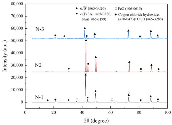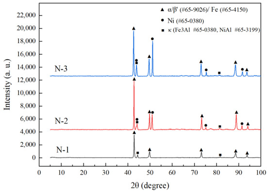 The XRD analysis was carried out to further determine the presence of the phases in the deposited layer (Figure 2). Similar diffraction peaks in patterns can be observed for the three samples. Due to the similarity in composition and crystal structure, the diffraction peaks of α-Cu and β’ phases overlapped [16], and so did α-Cu and Fe. It is observable that the microstructure of the deposited layer mainly consists of the α-Cu phase, some portion of retained β (β′) and series of intermetallic κ precipitates. Especially, the surfaces tested by XRD include both the deposited coating, so that nickel phases existed in N-2 and N-3.
