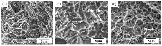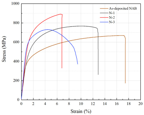 Figure 3 shows the tensile stress–strain curves of as-deposited NAB alloy and three composite structures. Table 4 lists the room temperature tensile results of the samples. The tensile strength of the three specimens exceeds the strength of as-deposited NAB. Figure 4 shows the tensile fractographs. The fracture occurred on one side of the NAB, and there were many dimples on the fracture surface, indicating that N-1 is a ductile fracture. Both N-2 and N-3 fractured near the intermediate layer. N-2 has the lowest elongation among all samples, few dimples and cleavage planes can be found in its fracture surface. The liquation crack of intermetallic compounds caused by the high Al content of the NAB near the interface was probably the main reason for the fracture.