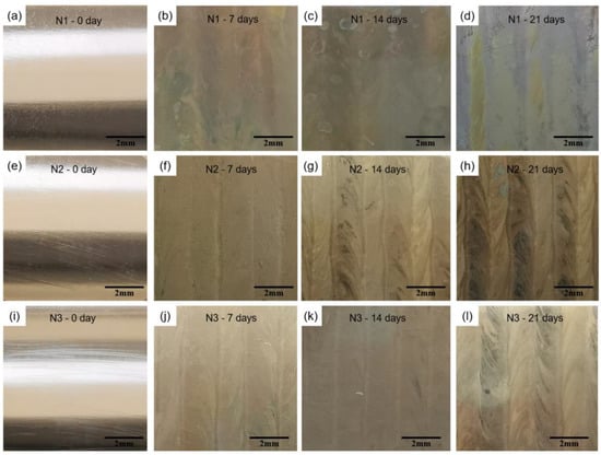 Photos of surfaces immersed in NaCl solution after 0, 7, 14 and 21 days of (a–d) N-1; (e–h) N-2; (i–l) N-3.