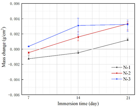 Figure 6 shows the weight changes of samples after different immersed time compared to their own original weight value before immersion. N-1 lost the most weight after immersed for 7 days, and the weight loss was lower after 14 days than that of 7 days. The weight change turned to an increase after immersed for 21 days. N-2 lost weight after immersed for 7 days and then the weight changes displayed an increase as the immersed time got longer. The weight of N-3 increased higher and higher from 7 days. Mass changes did not show a stable trend. The reasons for weight change most likely related to the formation of corrosion product film, film dissolution, cation dissolution of matrix and other factors.