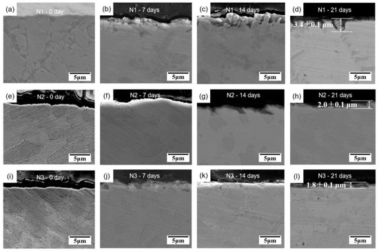 The cross-sectional morphologies of three groups after immersed in 3.5 wt.% NaCl solution for different periods: (a–d) N-1; (e–h) N-2; (i–l) N-3.