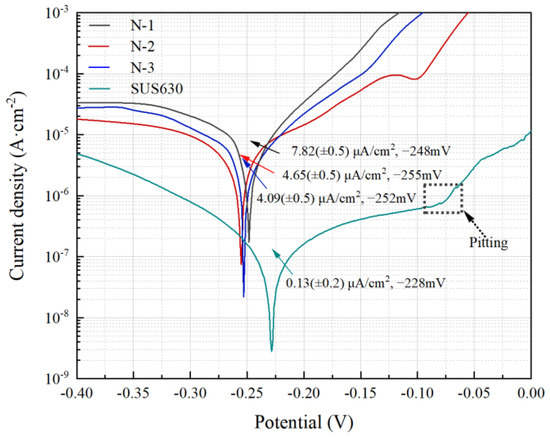 Potentiodynamic polarization curves measured in 3.5 wt.% NaCl solution.