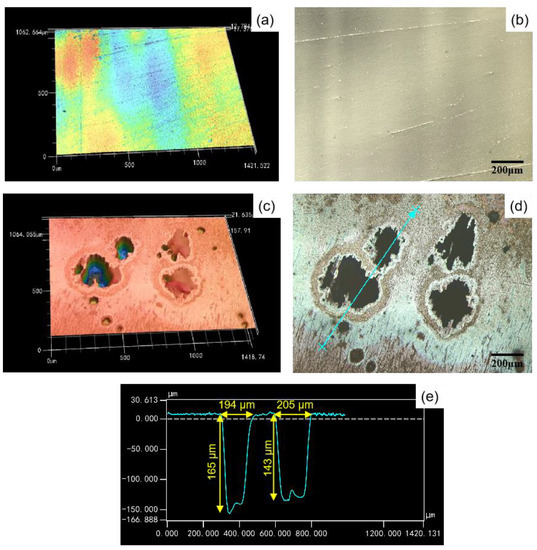 Figure 9 shows the potentiodynamic polarization curves of NAB coatings with different intermediate layers as well as the steel substrate in 3.5 wt.% NaCl solution. The corresponding corrosion current density (icorr) was determined by the Tafel extrapolation method. The icorr of N-1, N-2 and N-3 were 7.82 (±0.5), 4.65 (±0.5) and 4.09 (±0.4) μA cm−2, respectively. The corresponding corrosion potential (Ecorr), Tafel slopes (ba, bc) and the polarization resistance (Rp) calculated by the Stern–Geary relation [18] are listed in Table 5. This indicates that the NAB coating with the Ni-based intermediate layer exhibited a lower corrosion rate, and N-3 possessed a better corrosion resistance among all samples. The higher the Rp values of N-2 and N-3, the higher the resistance to corrosion [19]. The corrosion current density of SUS630 stainless steel was measured as 0.13 (±0.2) μA·cm−2, which was lower than that of the deposited NAB alloy, but the steel was rarely considered as propeller or other load bearing components to directly cope with seawater corrosion because of its high pitting propensity in the media containing chloride ions [20,21]. Figure 10 shows the surface morphologies of N-3 and SUS630 steel examined by confocal laser scanning microscopy after polarization. The pitting corrosion could be clearly seen on the surface of the steel samples, which was consistent with the polarization result shown in Figure 9 as the pitting potential presented in the curve. On the contrast, no obvious pit was found on the surface of the polarized N-3.