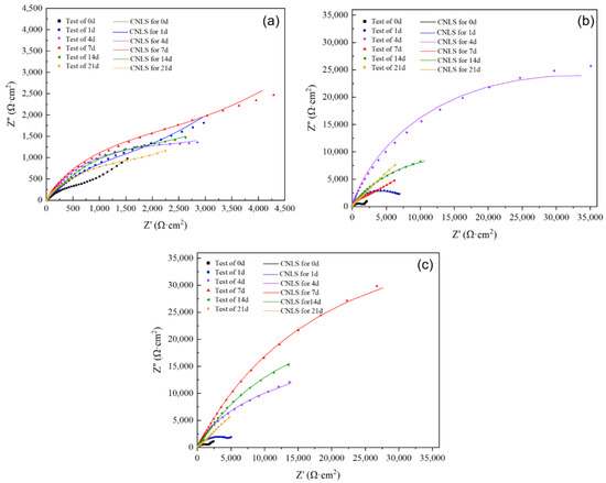 Nyquist plots of NAB alloys after different immersion periods in 3.5 wt.% NaCl solution: (a) N-1; (b) N-2; (c) N-3.