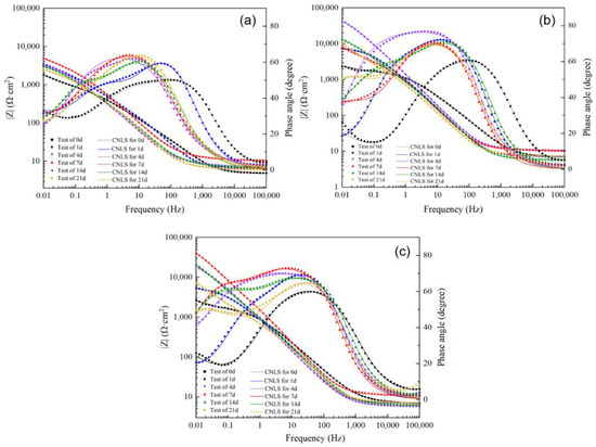 Bode plots of NAB alloys after different immersion periods in 3.5 wt.% NaCl solution: (a) N-1; (b) N-2; (c) N-3.