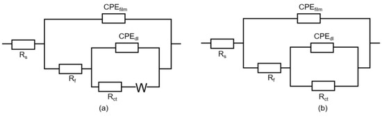 The equivalent circuits used in fitting of the impedance data: (a) with Warburg; (b) without Warburg.