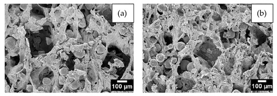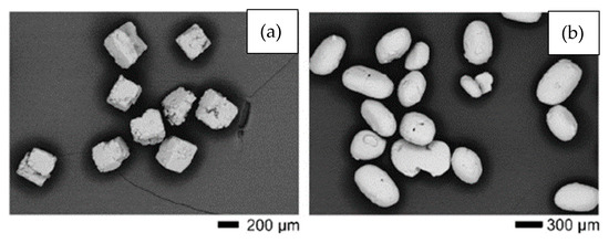 Particle shape also has a great impact on the properties of the foams produced. As mentioned above, spherical high-purity powders are the most desirable for use in MIM. However, their higher cost represents an important disadvantage. The shape of the powder is normally dependent on the production method. Common particle shapes of Ti powders are spherical and angular or irregular. Spherical Ti powders are usually produced by gas atomization. In comparison, angular Ti powders are typically produced by the hydride–dehydride process, and they are relatively cheaper. Recently, researchers have used non-spherical titanium hydrogenated-dehydrogenated (HDH) powders [44,45,46], produced by mechanical milling of sponge, scrap, or ingots [47], and titanium hydride (TiH2) powders [22,48], which have lower levels of purity and flowability but are acquired at a lower cost. Figure 2 shows the (a) gas-atomized and (b) HDH powder morphologies used by Tuncer et al. [28].