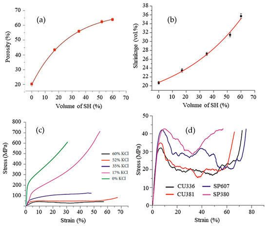 Figure 6, taken from Shbeh et al. [30], shows the dependence of the amount of porosity, volume shrinkage, and mechanical strength on the percentage of SH feedstock. It can be seen in Figure 6a that, the higher the SH content, the greater the porosity. However, this relationship assumes a logarithmic behavior, with a large increase in porosity at lower SH contents. For contents higher than 50% SH, there is little porosity gain, and the curve becomes asymptote. The authors attributed this behavior to the greater volume reduction in the samples (Figure 6b) with increasing content of SH since the Ti particles need to travel greater distances during sintering to initiate atomic bonds with each other and form cell walls. These movements result in greater volume shrinkage of the samples. Figure 6c shows the dependence of compressive strength on porosity. The stress–strain curves for foams made with a high porosity, especially those obtained with 52% and 60% of SH (by volume), showed a much longer plateau region before densification compared to those with a low porosity. The foams with a high porosity have a more uniform porous structure and undergo more uniform deformation until densification, while those with a lower porosity reach densification earlier. In the same study, Shbeh et al. [30] used different amounts, shapes, and sizes of the KCl as a space holder to evaluate the pore morphology in titanium foams. The impact of the shape of the space holder on the final porosity was not significant. On the other hand, as shown in Figure 6d, the shape of the SH particles has a great influence on the mechanical properties of the foams produced. The Ti foams produced with the cubic SH showed lower yield stress than those made with the spherical SH, probably due to the stress concentration at the corners of the cubic pores. The particle size and shape of the SH also influences the flowability of the material during MIM processing and the preparation of the powder mixture, which can lead to clogging or poor filling of the mold due to the low pressure and temperatures used in MIM.