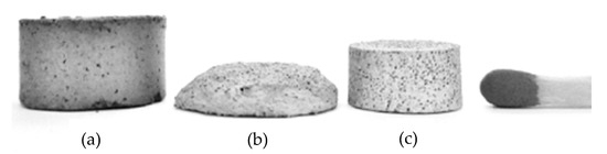 One of the difficulties in the production of titanium foams via MIM is the maintenance of the part dimensions during sintering, mainly due to poor properties of the green material, phase change, a sudden variation in temperature during thermal debinding or sintering, and contamination by the binder. Moreover, in the case of parts with proportions of space holders above 55%, it is difficult to maintain their shape after injection, hindering the manufacture of implants with porosity greater than 50%, an appreciable percentage for foams. Several studies have focused on better understanding the dimensional stability of parts produced via MIM. Daudt et al. [27], for example, applied a plasma treatment to MIM samples after the chemical removal of binders and before thermal removal. The microwave plasma treatment cleaned the surface of the component, keeping the properties of the part intact and facilitating the thermal removal of binders. Figure 7 shows the samples obtained by the authors. The researchers noted that the plasma helped to maintain the shape of the part by stimulating a pre-sintering phenomenon (Figure 7c), creating small connections between the powder particles even for porosity above 50% and at a much lower temperature than that used in sintering in addition to maintaining open porosity.