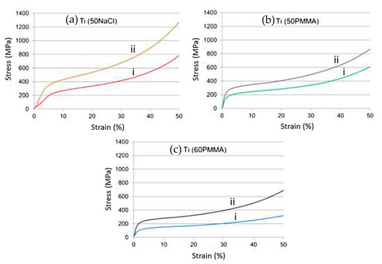 Compression behavior of porous titanium parts sintered at 1000 °C (i) and 1200 °C (ii) with (a) 50% of NaCl, (b) 50% of PMMA, and (c) 60% of PMMA as SH. Adapted with permission from Ref. [22]. Copyright 2022, Taylor and Francis.