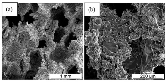 One concern during sintering is related to the surface of the parts and the presence of micrometric pores (~0.1–1 µm), structures almost always present in sintered materials [94]. Micropores can be beneficial in implants with biomedical objectives aimed at the growth of bone towards the implant and the transport of nutrients and body fluids [95]. On the other hand, micropores can reduce mechanical properties by concentrating stresses and inducing the appearance of cracks [96]. Figure 9 shows (a) macroporous and (b) microporous structures acquired by scanning electronic microscopy (SEM).