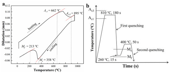 The material was received as ~2 mm, commercial, hot-rolled 0.2C–1.7Si–1.9Mn wt% steel. The 35% CR and 75% CR sheets were prepared by subjecting the as-received steel to 35% and 75% cold reduction in thickness, respectively. The expansion curve of the hot–rolled 0.2C–1.7Si–1.9Mn wt% steel during heating and cooling was measured with a Gleeble 3500 type dilatometer, as shown in Figure 1a. The Ac1, Ac3, Ms, and Mf temperatures of the as-received steel were 662 °C, 895 °C, 358 °C, and 213 °C, respectively. According to the measured Ac1, Ac3, Ms, and Mf temperatures, the annealing, quenching, and partitioning temperatures of Q&P treatment were formulated, as shown in Figure 1b. The 35% CR and 75% CR sheets were rapidly heated to 810 °C in a muffle furnace and held for 180 s before undergoing an immediate quenching (first quenching) to 260 °C for 15 s in a salt bath and being transferred into another salt bath at 400 °C for 50 s. Last, the samples were quenched (second quenching) in water to room temperature.