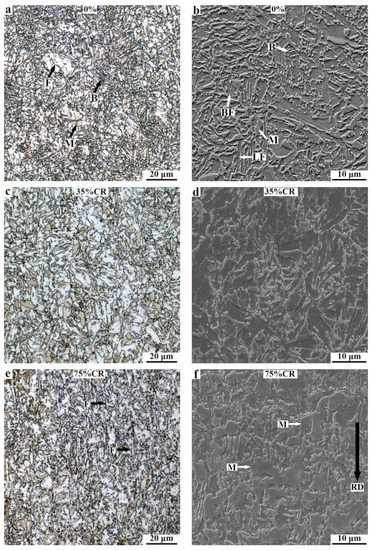 OM and SEM micrographs of (a,b) initial HR, (c,d) 35%, and (e,f) 75% cold reduction 0.2C–1.7Si–1.9Mn wt% sheets. B, F, and M refer to bainite, ferrite, and martensite, respectively. The rolling direction (RD) is shown in (f).
