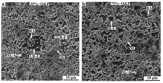Figure 3 illustrates the SEM micrographs of the Q&P samples prepared with 35% and 75% cold reduction sheets at the austenitizing temperature of 810 °C. UR–F, R–F, and RA refer to the unrecrystallized ferrite, recrystallized ferrite, and retained austenite, respectively. M1 refers to the primary martensite, which was formed during first quenching and was tempered in the partitioning region. The M2/A island refers to the secondary martensite/carbon-enriched retained austenite. The second martensite was formed at the stage of second quenching to room temperature. Compared with M1, M2 was not tempered in partitioning, thus, it exhibited higher strength and low plastic deformation ability [14]. The ferrite, M1, retained austenite, and M2/A island could be identified by their different responses [15,16]. The results indicate that abundant, small-size recrystallized ferrite grains and a handful of large-size unrecrystallized ferrite grains were discovered in the 35%—Q&P sample. Some granular (or block) retained austenite grains existed in the unrecrystallized ferrite grains. In addition, some M1 and M2/A islands were present in the sample (Figure 3a). The microstructures of the Q&P sample prepared with the 75% CR sheet were different from those of the Q&P sample prepared with the 35% CR sheet. Large-size unrecrystallized ferrite was not discovered in the 75%—Q&P sample, and the size of recrystallized ferrite grain in the 75%—Q&P sample was larger than that in the 35%—Q&P sample (Figure 3b). Moreover, the content of M1 in the 35%—Q&P sample was higher than that in the 75%—Q&P sample.