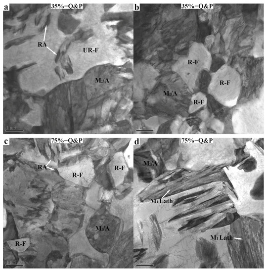 Figure 5 shows the typical TEM microstructures of the 35%—Q&P sample and 75%—Q&P sample. The TEM micrographs indicate that the large-size unrecrystallized and small-size recrystallized ferrite grains coexisted in the 35%—Q&P sample (Figure 5a,b), which is consistent with the EBSD results. Meanwhile, the retained austenite with irregular morphology and M2/A islands were distributed in the ferrite grain and at the grain boundary, respectively. Recrystallized ferrite, retained austenite, and M2/A islands were also present in the 75%—Q&P sample (Figure 5c). However, some M1 laths were discovered in the sample (Figure 5d).