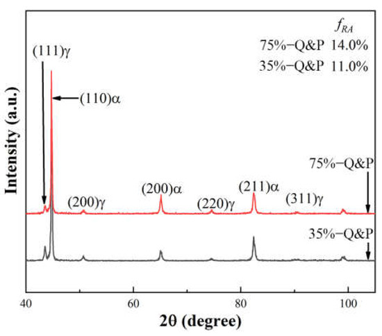 XRD spectra of 35%—Q&P sample and 75%—Q&P sample. The volume fractions of retained austenite of the two samples are presented in the figure.