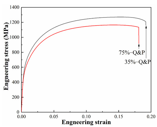 The engineering stress-strain plots of the 35%—Q&P sample and 75%—Q&P sample are shown in Figure 7. The mechanical properties are summarized in Table 1. The plots of the Q&P samples indicate that the engineering stresses first increased rapidly (elastic deformation) and then slowly (plastic deformation), before declining at the necking stage with the strain being increased. Compared with the 75%—Q&P sample, the 35%—Q&P sample had higher maximal strength and strain to fracture. The tensile strength and total elongation of the 35%—Q&P sample were higher than those of the 75%—Q&P sample (1194 MPa vs. 1164MPa, 19.18% vs. 18.11%). The product of strength and elongation (PSE) of the 35%—Q&P sample was as high as 24.37 GPa·%: 15.6% higher than that of the 75%—Q&P sample.