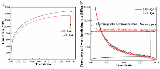 (a) True stress-strain plots and (b) strain-hardening rate plots of 35%—Q&P sample and 75%—Q&P sample.