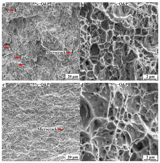 The SEM micrographs of the fracture surface of the 35%—Q&P sample and 75%—Q&P sample are shown in Figure 9. The fracture morphology of the two samples was dominated by voids, indicating that the fracture mode of the Q&P samples was ductile fracture. However, there were subtle but distinct differences in the fracture morphology of the two samples. Compared with the 75%—Q&P sample, the 35%—Q&P sample had more microcracks on the fracture surface, as shown by the red arrow in Figure 9a,c. Furthermore, the high-magnification fractography of the two samples indicate that the size of the voids in the 35%—Q&P sample was smaller than that in the 75%—Q&P sample (Figure 9b,d).