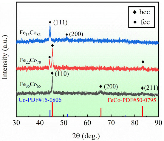 A brief schematic diagram of the experimental setup is shown in Figure S1. The three-electrode system was placed in a magnetic field as shown. The magnetic field is provided by the VSM system, and the strength and direction of the magnetic field can be easily adjusted. It is important that the magnetic field strength remains constant during each step of the test. The magnetic fields applied in the experiments are all provided by the VSM system. The XRD patterns of the three samples Fe35Co65, Fe22Co78 and Fe15Co85 are shown in Figure 1. It can be clearly found that the three samples have different phase structures due to the different percentages of Co. When the Co composition is 65 at.%, the three typical peaks at 2θ are 45.2°, 65.7° and 83.3°, corresponding to (110), (200) and (211) crystal planes, respectively, and are the bcc-FeCo phase structure (PDF#50-0795). When the Co content is 78 at.%, in addition to the three peaks mentioned above, 2θ peaks of 44.2°, 51.5° and 75.8° appear in the spectrum, corresponding to (111), (200) and (211) crystals, respectively. This is a typical fcc-Co (PDF#15-0806) phase structure, which shows that the sample Fe22Co78 has a two-phase structure of bcc + fcc. When the Co content is 85 at.%, a single-phase structure of fcc is obtained, which is consistent with the results reported in the literature [30]. It is well known that the bcc-FeCo phase behaves as a replacement solid solution. Since the atomic radius of the Co element (0.126 nm) is smaller than that of the Fe element (0.127 nm), the substitution of Fe by more Co in the FeCo phase may cause the lattice shrinkage of FeCo products [32,33,34].