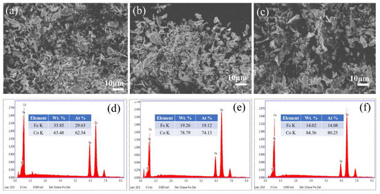 The microscopic morphology and particle size of the samples were analyzed by SEM. The SE IMAGES and EDS spectra of Fe35Co65, Fe22Co78 and Fe15Co85 are shown in Figure 2. The SEM in Figure 2a–c shows that the alloys powder obtained by sandpaper grinding are irregular micro-particles with fine dispersion and a particle size of 1–10 μm; the smaller particles will affect the magnetic properties of ferromagnetic materials [35]. The EDS in Figure 2d–f confirms that the composition ratios of Fe35Co65, Fe22Co78 and Fe15Co85 are in line with the stoichiometric ratio of the initial ingredients, which also shows that the surface of the alloy particles is slightly oxidized.